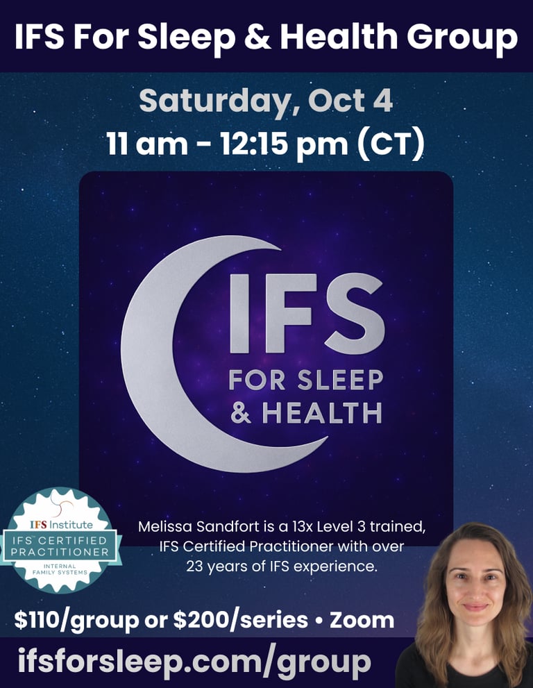 If you’re seeking a more intimate, smaller IFS group, consider joining the 5-person Deeper Intimacy with Yourself (DIY) IFS Practice Group which meets once a month for two hours. This month, the IFS for Sleep and Health Practice Group workshop will be Sunday, Sept. 28 from 11-1 pm CT.